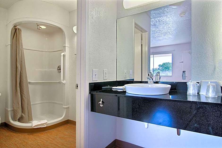 This room includes a roll-in shower and additional handicap accessible features.